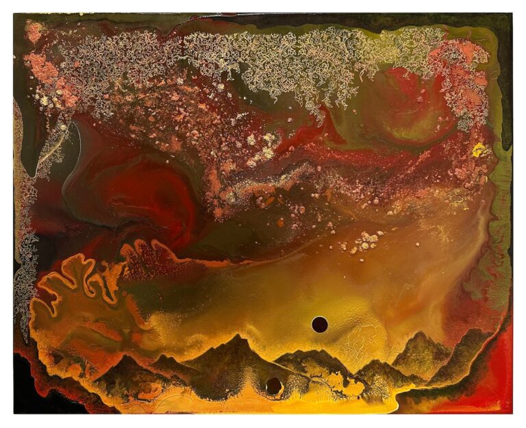 “This Time,” nevertheless, introduces a brand new factor to Ilchi’s method that marks a pivot in her work. Haloed kinds throw the composition into chaos. These filigreed paisleys is perhaps comets crashing to the earth from the heavens or spermatozoa surveying the craggy floor of an ovum. And even branches breaking by from the opposite facet of the portray, puncturing the skinny barrier between realms.