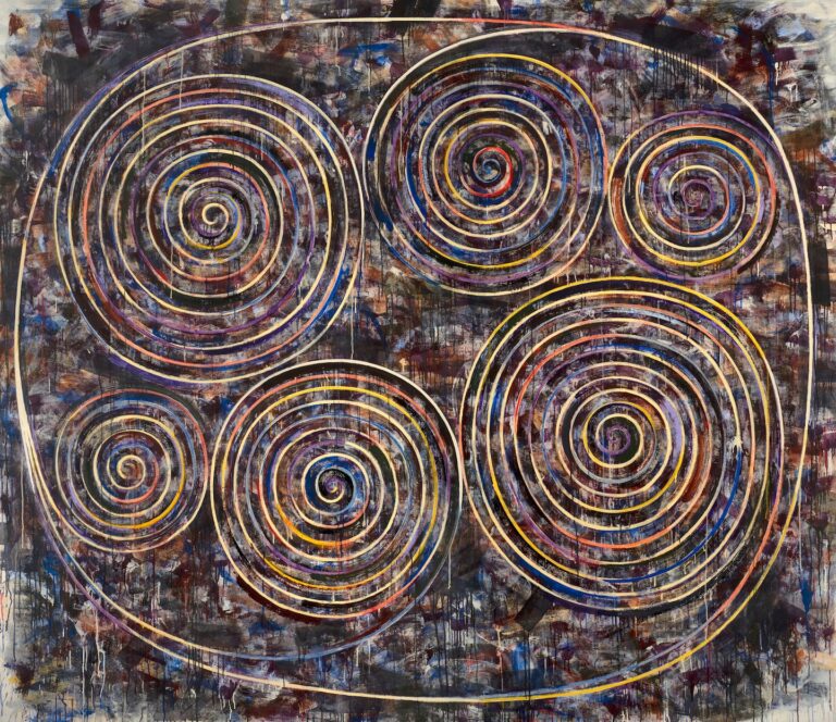 The place foreground and background had been as soon as interrelated and infrequently intertwined, they’re now extra distinct. A few of the footage overlay figures rendered with black strains atop fields of soppy, drippy daubs in a rainbow of hues. There’s even a portray punctuated by 4 circles of unpatterned, near-white blankness. These voids — uncommon if not unprecedented — come as a gentle shock in one of many artist’s intricate work. Maybe Cushner means to offer a couple of pathways into his profusely flowering imagery.